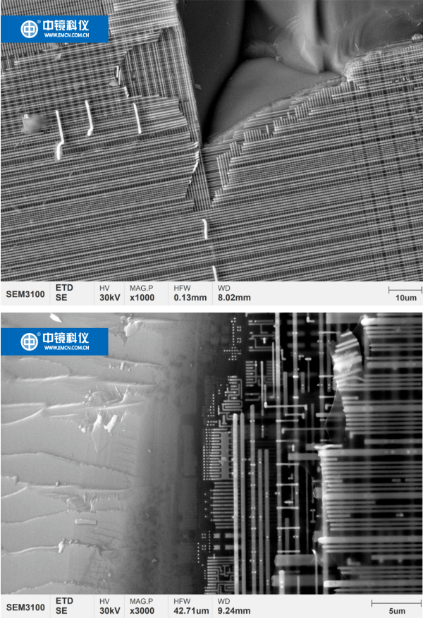 近日,國內(nèi)芯片行業(yè)喜報連連,8月29日,華為搭載麒麟9000S芯片的Mate 60 Pro正式上線,該芯片上行峰值網(wǎng)速可以達(dá)到5G標(biāo)準(zhǔn)。標(biāo)志著華為突破1079天封鎖!麒麟芯片正式回歸。8月30日中國移動宣布,國內(nèi)首款商用可重構(gòu)5G射頻收發(fā)芯片“破風(fēng)8676”研制成功。 電子顯微鏡被廣泛應(yīng)用于芯片設(shè)計、制造和分析,芯片設(shè)計者可以通過SEM深入了解芯片內(nèi)部結(jié)構(gòu),優(yōu)化電路布局和排線方式,提高電路的性能和功耗比,觀察和分析微小缺陷和結(jié)構(gòu)變化從而有效提高了芯片的可靠性和穩(wěn)定性,為芯片研發(fā)人員提供了重要的數(shù)據(jù)支持。 下面我們就隨著電子顯微鏡的視野走進納米尺度下芯片的世界: 本次選取了Intel奔騰4524(90nm制程)和Intel奔騰雙核E6600(45nm制程)和晶圓,利用掃描電子顯微鏡(SEM)進行了觀察。 首先,晶圓放大50倍后,可以看到整整齊齊地排列著數(shù)不盡器件和導(dǎo)線就像一座星羅密布的城池里面縱橫交錯的街道。 晶圓放大1000倍,可以看到一個個器件整齊排列,正如城池內(nèi)一個個建筑物。 cpu芯片放大了1000倍和3000倍,可以看到內(nèi)部的導(dǎo)線整齊地排列,像一條條復(fù)雜的高架橋,連接cpu內(nèi)各個部件。 放大5000倍,可以看到cpu芯片內(nèi)部有多個分層,而且每層連線的線徑、間距、走向均不一致,隨著層數(shù)越深線徑、間距越小。 放大到10000倍,可以看到最下層的部件,對比這兩款cpu,可以明顯看出Intel奔騰雙核E6600比Intel奔騰4524精細(xì)得多,經(jīng)過測量,分別為47納米和95nm,與制程參數(shù)基本一致。 芯片被譽為是人類智慧的“結(jié)晶”,看起來很小,但內(nèi)部結(jié)構(gòu)極為復(fù)雜,對于人類的各個方面生活都有著深遠(yuǎn)的影響和價值,電子顯微鏡和芯片一樣,同屬于“卡脖子”技術(shù),此次芯片的突破為我們注入一劑強力劑,只要我們牢牢抓住科技創(chuàng)新的“牛鼻子”,相信在不遠(yuǎn)的將來,“卡脖子”技術(shù)將被我們一一突破。 回頭望,中國芯道阻且長終破浪, 往前看,電鏡夢行而不輟看東方。 編寫:趙勝藍(lán) 攝影:郭 珊 制作:李慧芳 審核:王 萍 校對:李鳳麗、殷 雪